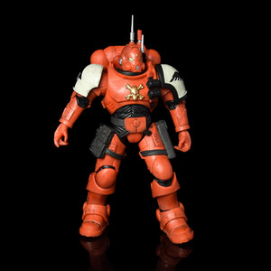 The Infiltrator has two slimmed-down pauldrons, both coloured in a bone white finish with sculpted scratches and dings. The right carries the squad markings of Tactical Squad VII. The left pauldron is edged in black and in the middle has the Chapter badge in black with a red blood drop at its centre. The armour is further decorated with a gold-painted crossed skull on the chest and augmented with a belt and ammo pouches, strapped around the thighs, and a pair of frag grenades on the upper chest. The entirety of the figure has been given some level of dark weathering to dirty up the red, a feature often missing on the base McFarlane Warhammer figures.