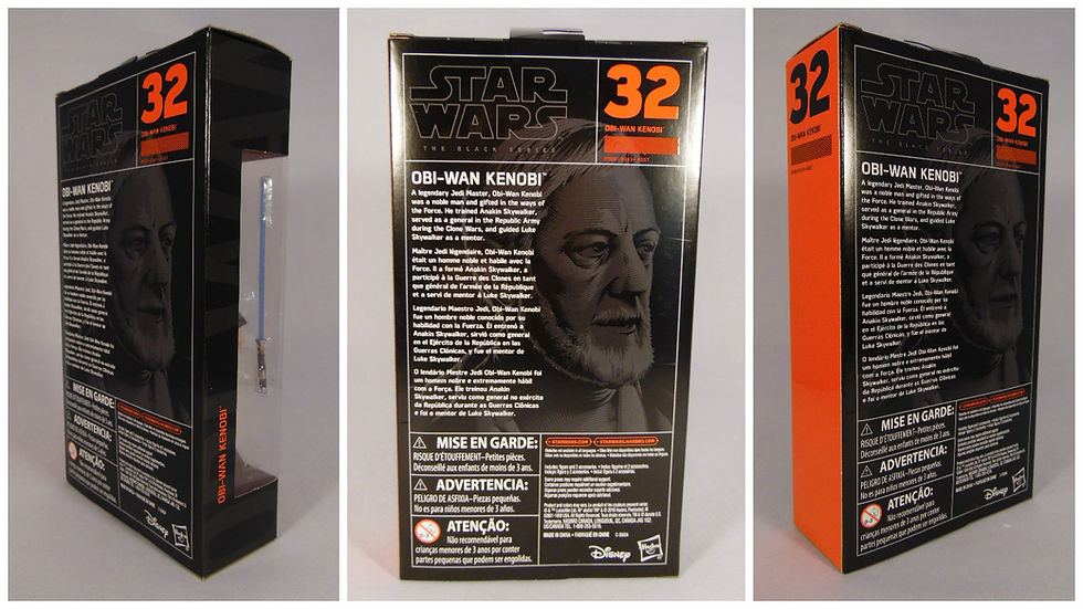 Round the back is a larger view of this Grey lined image. Onto this we have a short paragraph that tries to sum up Obi-Wan in just a few lines. It talks about his roles training Anakin Skywalker, fighting in the Clone Wars and being a mentor to Luke. This text differs from the more in depth text that was added to the larger SDCC package. Like all the European releases, this text is repeated in 3 other languages down the back of the box.