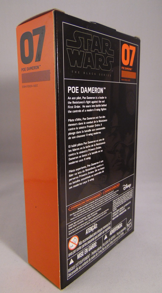 As a big fan of the original wave 1 Luke in X-Wing outfit I was really looking forward to getting my hands on Poe Dameron from The Force Awakens. Poe is number #07 in the TFA range and is part of the 2nd wave. Poe arrives in the now familiar black and red box, decorated with the grey lined artwork that has been consistent on the Black Series packaging since its inception in 2013. Poe is illustrated on the packaging in his X-Wing helmet and appears on the front lower right panel as well as on the rear along with a very limited, "no spoilers", blurb about Poe.