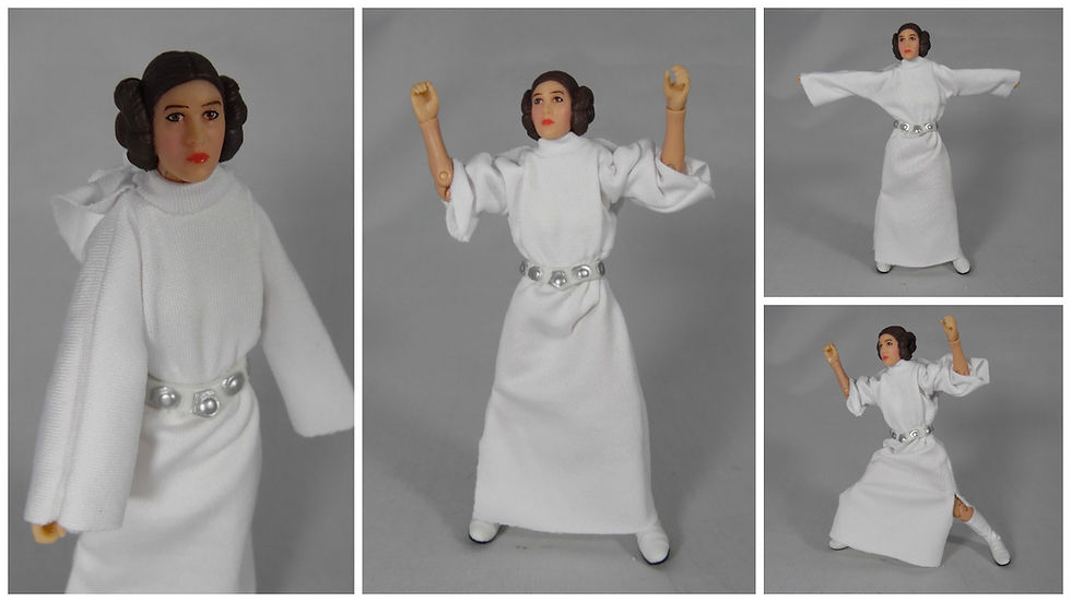 The other is the E11 blaster she takes from Luke to blast her way out of the detention centre. The cast is the same one used on the Original Trilogy Storm Troopers to date and that came packed with Luke & Han in their Storm Trooper Armour. It has been tweaked ever so slightly with a touch of silver paint to the side of the barrel. With such articulated arms it is easy to get Leia to hold this in two hands and this really defines the figure - a princess in a pure white dress, but toting a blaster rifle and looking determined. That just about sums up Leia and Carrie.