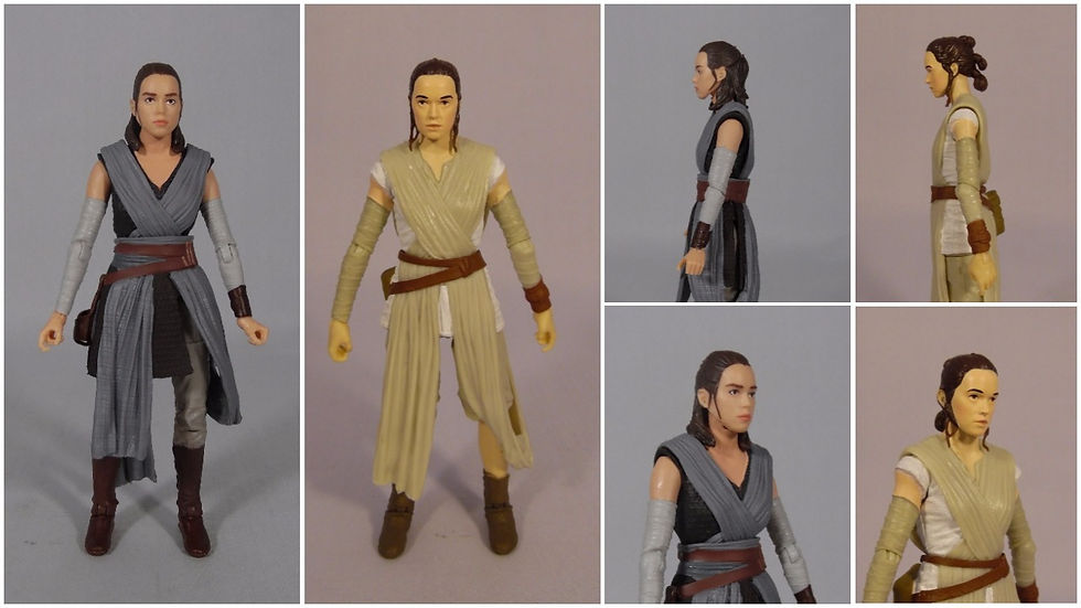 While the costume is very similar, there is no re-use and instead everything on the new version is brand new. When you compare the two versions side by side you can see how the older figure is a touch smaller - it seems with the new Rey figures (here and with her speeder) have fixed a height concern. The older Rey is also a little bulkier and on reflection this isn't accurate of Daisy Ridley's sight frame. The new figure is much more accurate.