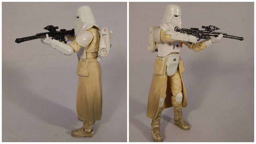 The larger weapon, the DLT-19 heavy blaster, is the same as was packed with the original Stormtrooper. While cast in black plastic, it is heavily dry-brushed in silver to bring out the details. Out of the two it is the DLT-19 that not only looks better, but also poses better. With this weapon I got the Snowtrooper into a bunch of poses - including a two handed carry pose, but also a sniping/firing position.