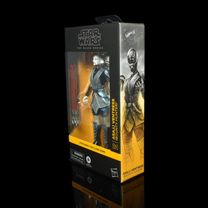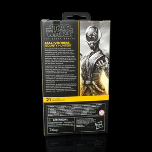 Ventress is packed into the standard Galaxy Collection matt black box, and in the Clone Wars series, using the golden yellow accent colour on the text and the side art, which depicts Ventress in her helmeted Bounty Hunter gear. She is number 21 in the Clone Wars collection, the side art connecting into the Jedi Temple Guard release from 2025.
