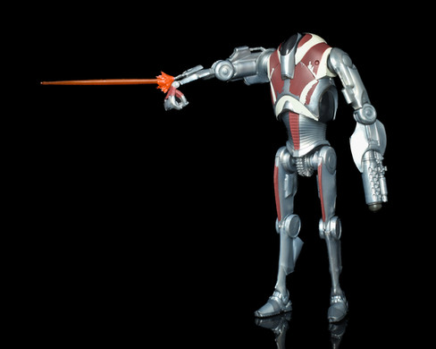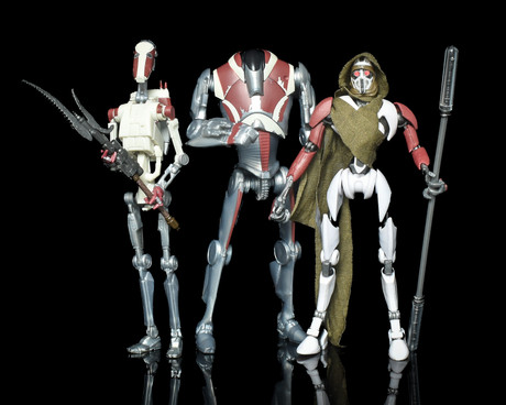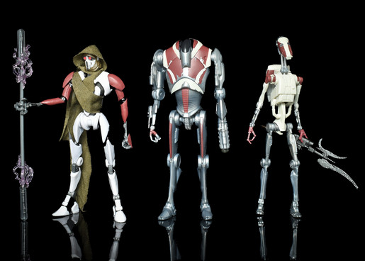 The final figure is probably the most visually impressive, the Magna Guard also uses the existing figure but with redesigned soft goods that create the droid and individual styling where they wrap the chest and extend out as a rear cape section, and then up and over the head as a hood which can be displayed up or down. The droid itself is white on the outer parts and gunmetal silver on the joints while the arms are given the burgundy red tones of the Raiders. A brighter red is used on the Manga Guard’s eyes with silver and black then worked into the components of the head to create the features.