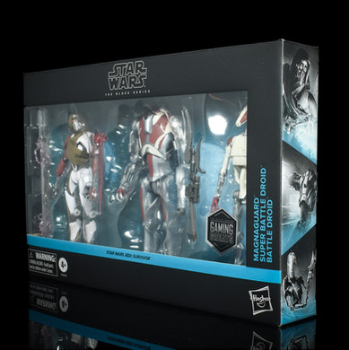 All three of the droids are good recreations of the Droids we see in the game with relatively accurate paintwork albeit missing some level of weathering or damage that the Droids on Koboh. While the figures themselves are more or less the standard releases repainted, it is nice to see some very specific updates to mirror the game - particularly the Melee B1 Droid weapon, the Super Battle Droid’s additional gun arm, and the Magna Guards soft goods. The included effect pieces are OK, but there are engineering issues in connecting both types to their appropriate weapon. It is however good to have the choice considering Hasbro could have omitted them altogether.