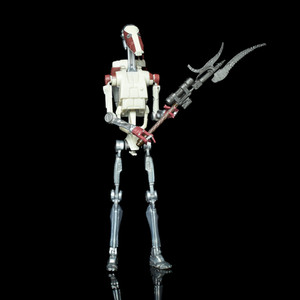 Our B1 has a new weapon, one of the salvaged and hybrid weapons that we see the B1 Droids use to fight in the game. This one has a central section in grey that appears to be the barrel and sights of a blaster rifle. To one end is a brown turned handle, and to the other are two large curved blades to make this a melee weapon. As the B1 hands were designed to hold their own blaster, and as they haven’t been updated for this set, the grip on the weapon isn’t fully secure, but it will hold loosely once posed in either or both hands with the articulation allowing for some attacking posing.