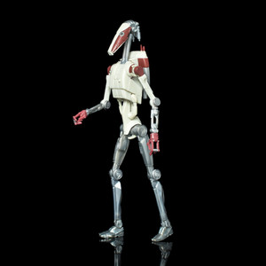 The first of the set is the B1 Battle Droid. This does not differ in construction from all the other Battle Droid releases and features the same backpack - which is removable. The upper body is cast in cream like the original Trade Federation Droids but then includes ‘Raiders’ paintwork including burgundy markings on the shoulders, hands and the backpack - and a full silver paint job for the forearms. The silver also continues in the legs which are entirely a silver finish. The head extends on a twin stemmed silver neck with a beige base colour and burgundy red trim to either side over the eyes.