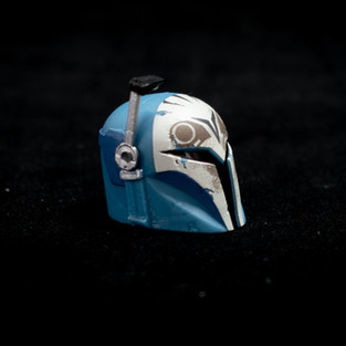 The body is all-new, with the usual mix of an undersuit - in grey - on top of which the various elements of Mandalorian armour are placed. The key colour theme of the armoured panes is the blue of the Nite Owls with the Nite Owl emblem placed on each shoulder as a decal. The chest armour is a metallic finish and over this are a couple of sections that recreate battle damage and scratches. A similar level of weathering is applied on the blue armour panels in grey to recreate dirt buildup.