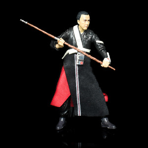 Chirrut, like the rest of the wave, is an update on his original 2017 figure. He comes in his black outfit overlaid with soft goods lower skirt in black and red. These soft goods have been shortened from the original release, a small change but one that helps Chirrut look more accurate with his on-screen costume length and for some reason makes him look a bit more ‘ready for action’. The costume is concluded with a cream strap that connects to some components on the front around the waist, and too a black cape in soft plastic around the rear. The device on his belt, and a second on his left wrist and hand, contain the majority of the detailed paintwork with red, grey and silver painted components.