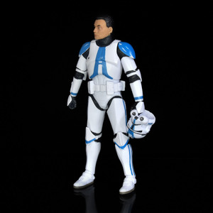 Appo is created on the new Clone Trooper body with modular parts that reduces the requirement for painting and presents a crisper transition between white Clone armour, and the black undersuit. Over this crisp white armour are the blue markings of the 501st applied to chest, arms and legs with a weathered application to depict both the hand-painted origin of these markings and elements of battle damage with scratches and edge wear. The colour of the markings is a contentious decision by Hasbro as the blue is out of line with all the other 501st Clones released to date, having much more of a green hue within the blue. This colour is actually accurate to the costumes used for Kenobi, but not as we see them on screen after the lighting and post-production is applied. While the accuracy to the prop is applauded, Appo would have perhaps been best served with a colour palette in line with his fellow 501st Clones.