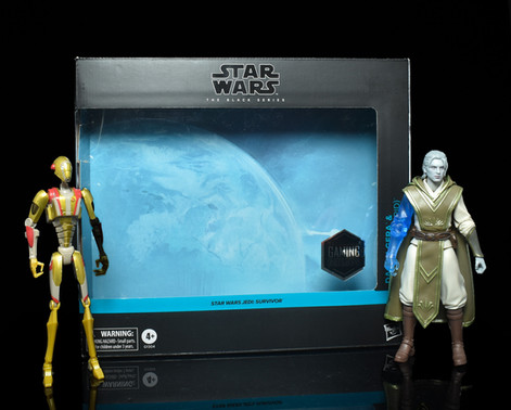 The Star Wars Black Series Gaming Greats releases of Dagan Gera and the BX Droid (Hybrid) were a late Spring 2025 release, sold exclusively by Amazon globally. The set was based on the Jedi: Survivor videogame and featured variations of Gera and the BX, who had both had single releases earlier in 2024 and into 2025. The double window box features the blue, almost teal, highlight color, which is employed on the character text as well as on the artwork.
