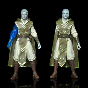 The big variation to the single release in Galaxy Collection Wave 20 release of Dagan Gera is the addition, in this two-pack, of a Force construct right arm. This replaces the hanging sleeve we see on the general release and creates a fully articulated right arm for Dagan in a translucent blue plastic similar to that used on some of the Holocomm figures.