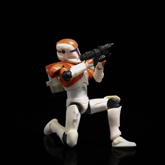 There is an attempt to weather the figure with the application of a final paint app in certain areas. It doesn't quite make up its mind what it wants to be with the shoulder looking like the orange has scratched off to reveal the white beneath - while the midriff and legs have grey almost silver splashes which are either meant to be dirt or indicate the white armour is scratched and revealing a metal silver underneath - which of course is not possible as the armour is a Plastoid