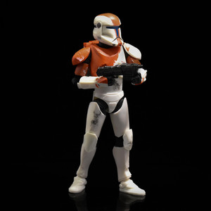 The Armour is all cast in white, and a duller white as opposed to the gloss we have seen on other Clone Troopers. Over this is painted the orange markings for Boss including the large chest section and shoulder pauldron. The markings are all executed as though applied by hand by the Trooper themselves which leaves rougher edges. The upper arms are cast in black rather than white and therefore the orange painted over the two upper arms is much duller than the other armour panels. The helmet is a new piece to the line and is a full solid piece with no sculpted head underneath. It is also cast in white with the orange stripe allied with rough edges. We also have a blue metallic, almost mirror-like visor, and grey details on the breathing apparatus and to the sides of the helmet.