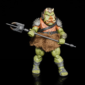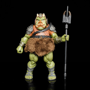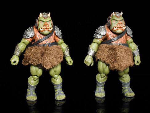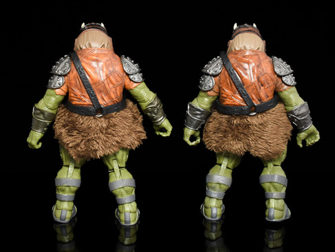 Articulation is a standard 16-point system plus an additional 17th point on the jaw which is pinned internally so the mouth can be opened and closed to vary the look of your Gamorrean(s) on display. The other articulation includes pinned joints on the arms and knees but holds a reasonable range of positions considering the bulk of the Gamorrean body. While he won’t sit or kneel, there are sufficient options to wield any of the three weapons in neutral or dynamic stances, and the low centre of gravity makes the Gamorrean an extremely stable figure once posed - including walking or running poses.