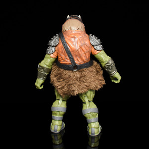 Our Gamorrean Guard is modelled after their ROTJ appearance with a squat green-skinned muscular body, protected by bronze/brown chest armour and a pair of gunmetal shoulder panels. The armoured sections featured sculpted details as seen on screen with a central circular icon on the Gamorrean’s chest, and other shield-shaped icons across the shoulders. The outfit is completed with a black plastic shoulder and waist strap with silver buckle and a brown skirt section which features a dark brown sculpted waist/groin section covered over with a soft goods fur skirt piece. The fur soft goods work as intended and hold a good shape while also moving with the leg articulation if needed.