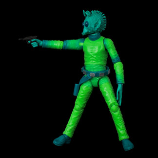With such a slim build, Greedo is easy to pose without anything to get in the way of any of the limbs. He can shoot (first or second) draw or holster his blaster and gesticulate with his extra long fingers.