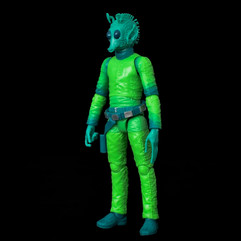 The premise of these Vintage Kenner inspired figures is to take the existing Black Series figure and tweak and recolour it as it was in the 1970's and 80's. For Greedo, this means a full bright green jumpsuit with darker green rings around the elbows. The head and hands are presented in a similar blue with darker glossy eyes.