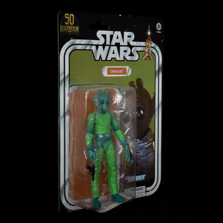 Greedo is one of these figures, released in May 2021 as an Amazon exclusive. Like the other Vintage carded figures in The Black Series, the card itself is a direct recreation of the original Kenner card down to the promo image, nameplate, backing colour and twin tramlines. The back of the card does continue the Vintage theme, but there is a modern twist added with the timeline for the Lucasfilm 50th Anniversary, under this is the text