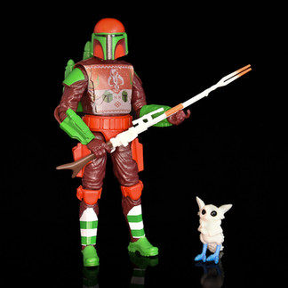 The Holiday Trooper is, like the rest of the line, a repaint of an existing figure - namely the 2020 Mandalorian Loyalist figure from The Clone Wars. The Loyalist colours are of course gone, and the Holiday Edition features a deep red suit overlaid with armour that ranges from green & white striped around the legs, to solid green and red panels and a red & green helmet. The torso is photo printed to recreate a knitted Christmas jumper with a Mythosaur skull and Mando helmet design.