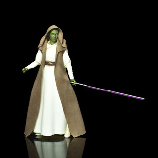 Rwoh comes with her lightsaber which is a simple hilt in gun-metal grey with a central gold trim. Into this slots a translucent purple lightsaber blade. The hilt can be slotted into Vernestra’s belt by way of a plug-in socket or will fit in either hands. There is however a considerable miss here as Vernestra is renowned in the High Republic books as using a light whip - also seen briefly in in the series - but a choice has been made not to develop or include a light whip blade to use with the saber hilt.