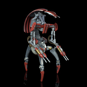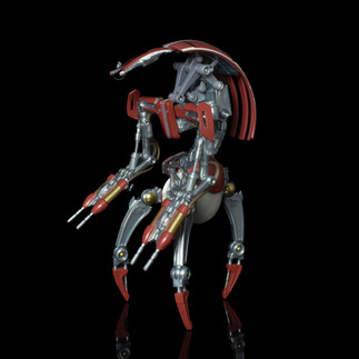The Droideka has no accessories. Its articulation is all designed around the engineering of the Droid in fighting position. There are around 24 joints throughout the droid's body, some of which have been enhanced with metal pegs to support what is quite a precarious design. The three legs are all jointed in two places and again with a final pivot where they connect to the domed reactor section. From here, the spine piece has a couple of joints to adjust the stance and height, as well as a pair of hinged panels that can extend out or fold in.
