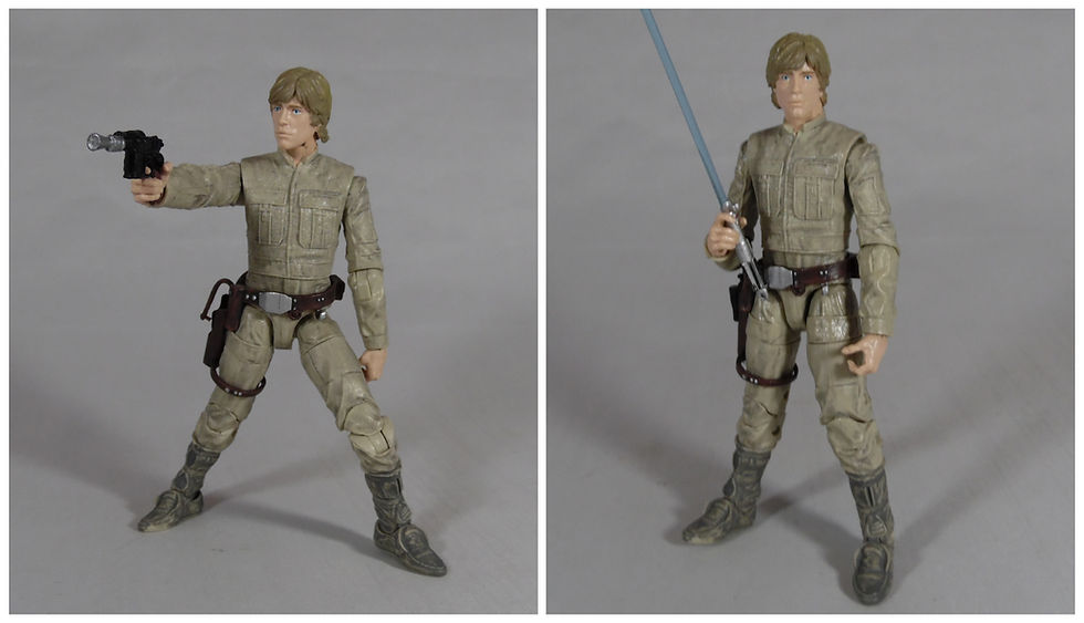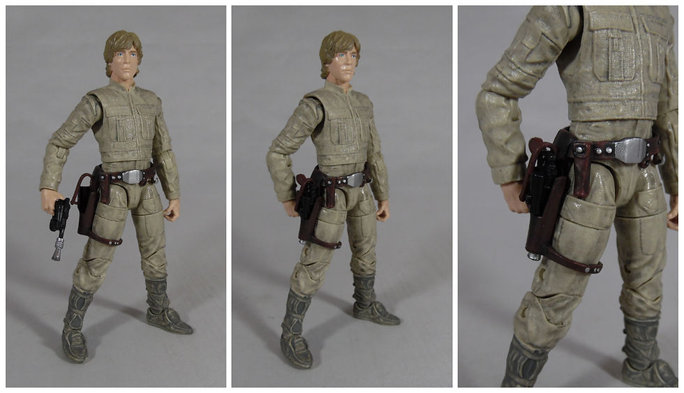 Luke has 16 points of articulation starting with a ball jointed head complete with pivot - which can be slightly unsightly from certain angles. There is a waist ball joint just above the belt which allows Luke to lean forward and backward as well as turning to the sides. The legs are ball jointed hips, with quite a gap between hip and groin to allow full movement. Below this is a thigh swivel, double jointed knees and ankle rockers.Being a loose part the thigh strap for the holster moves with the leg and does not' restrict any movement.