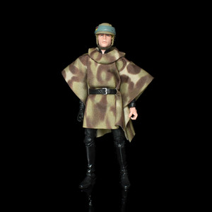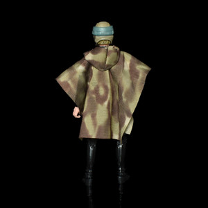 Luke is built on the older 2014 Jedi Knight Luke figure body, with the entirety of the undersuit cast in black plastic and variation provided only on the boots, which are a glossier finish. The chest section, removable on the older figure, is now fixed in place, and the belt is updated. This black belt, with a silver painted buckle, is used to hold the soft goods poncho in place and can be undone and taken off the figure, or worn without the poncho. The poncho itself is an olive green base colour with brown and green camo colouration added. It is tailored to include a thick collar and a hood which is stitched in the down position. The lower part of the Poncho is designed to be held in check by the belt, and the overall look is a good likeness to the Endor combat gear worn by Luke.
