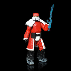 Each Holiday figure is a repaint of an existing figure, in this case, the Imperial Range Trooper as released in 2018 for the Solo movie. The holiday edition Range Trooper is painted to look like Santa Claus so the main armour and suit is painted in bright red, with white fur lined shoulders and trim. The belt is painted black, as are the gloves, and the large magnetic boots, which are also given a snowy effect drybrush around the soles and up the sides.
