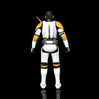 Cody’s armour is a variation of the usual Clone Trooper configuration with a different left shoulder Pauldron that features an extended white, soft plastic aerial. The amrour is finished off with a combat belt featuring multiple pouches - some in grey, some painted orange, and a couple in a silver finish. Cody is also sporting a variant backpack with an inverted tear drop design and a central panel in grey and silver. This is not removable.