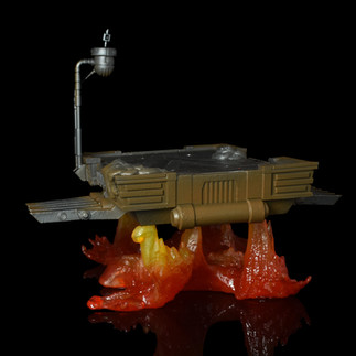 The main hover platform sits on its translucent orange and red lava base through four connecting posts. It is cast in hard plastic with a brown base colour and a painted upper platform in silver and grey. Further details include the two protruding slatted platforms, a couple of lumps of cooled lava slag, and a control vein that sits up on one side on two upprights and includes a rotating control level at the top.