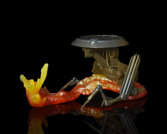 This droid sits in its own lava stream via a socket on the underside and a hidden plug within the lava. The droid only goes in one way, and when engaged, the left-hand side manipulator arm section also slots into a shaped insert in the lava to hold it level.
