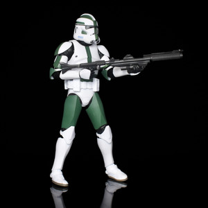 Clone Commander Gree has been released previously in the line, but wearing his Camo gear from the Battle of Kashyyyk and as seen in the Revenge of the Sith scenes. This new two-pack steers away from this design and brings us Gree in what would be considered the standard armour and markings for the 41st Elite Corps and based visually on comic book art for Commander Gree. The figure therefore utilises the standard and newest Clone Trooper body with white cast armour parts over a black inner body and joints. The green markings of the 41st are added over the armour and in neat, straight lines without the intentional rough markings we have seen on other Clones to reflect the battlefield marking of their armour.