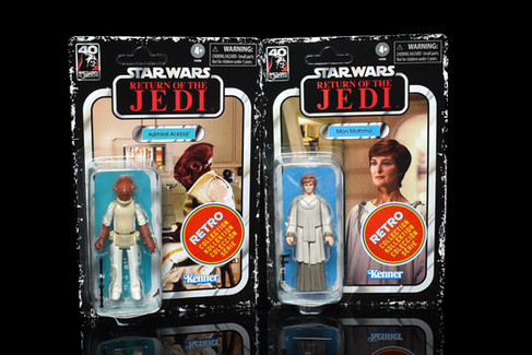 Each of the figures replicating the original Kenner releases is packed onto a reproduction card using the same artwork, tramlines and Return of the Jedi logo. Like the box, each card features fake weathering and carries the Return of the Jedi 40th Anniversary logo to the top corner, and the Kenner logo bottom right, rather than that of Hasbro. Each figure also carries a sticker confirming it as a modern Retro collection reproduction; these can be removed if desired.