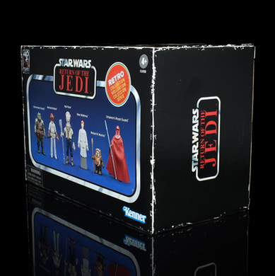 Like the A New Hope Set, the Return of the Jedi box keeps things simple in terms of design with a black base colour with faux foxing around the sides. The original Kenner Return of the Jedi logo is then used to head up a blue centre panel, trimmed in the tramline silver, and containing an image of the six included figures. To each corner, we have different logos with the 40th Anniversary to the top left, and the original Kenner logo to the bottom right. The two side panels are simply black with the ROTJ logo, while the back of the box is a repeat of the front albeit with some additional legal and copyright wording. The top of the box is the only part to include stills from the movie for each of the six characters, each image different to th eone used on the backing card.