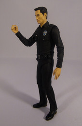 Let's look at the sculpt first, and it is as strong as any other NECA property. The heads, both of them, are a strong likeness for Lee Byung-hun and both portray that dead pan emotionless face that we have come to associate with any Terminator, be it Arnie, the original T-1000 Robert Patrick or indeed Lee Byung-hun's portrayal in Genisys. The damaged head is my personal favourite as it shows the T-1000 for what it is and the liquid metal crater here is really well done as it goes back into the head cavity itself giving depth to the damage. The body sculpt is reasonably plain, so doesn't lend itself to large amounts of detail. The Police Uniform is neatly done with the relevant pockets, buttons and lapels. The belt and holster accommodate the supplied revolver and the Police Department Badge is replicated well enough on the chest. Where the head damage was really well done, I found myself disappointed with the damaged chest option. Rather than any extension back into the torso, the liquid metal holes here look more stuck on and float on top of the uniform rather than extend into it.