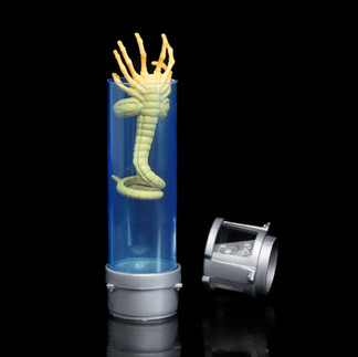 Included with the set is a stasis tank containing a facehugger. The tank is made up of two silver-grey ends with a blue-hued translucent tube in the middle. The Facehugger sits inside the tube, giving the impression it is submerged in water or fluid. Unlike the NECA version of this stasis tube, the compartment is not watertight so will not hold any liquid.