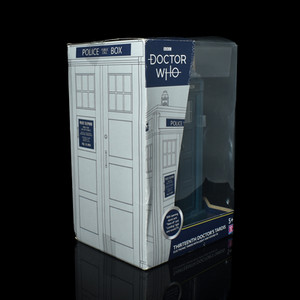 The packaging design established for the 13th Doctor and used until the 60th Anniversary was that of a grey base design featuring a TARDIS illustration, overlaid with TARDIS blue panels and the Whitaker-era Doctor Who logo. For the TARDIS, this was a square box with an angular front panel to the left-hand side, and a large wrap-around window taking up two-thirds of the box front and most of the right-hand side. There are roundel 'call outs' around each face of the box, all carrying the same information to confirm this TARDIS has lights and sounds effects. The left hand side is turned over to a blue lined image of a TARDIS against the grey background. Then the back of the box transitions to the dark blue colouring with an image of the TARDIS itself, and a lengthy piece of background text about the TARDIS and the Doctor, but nothing specific to the 13th Doctor.