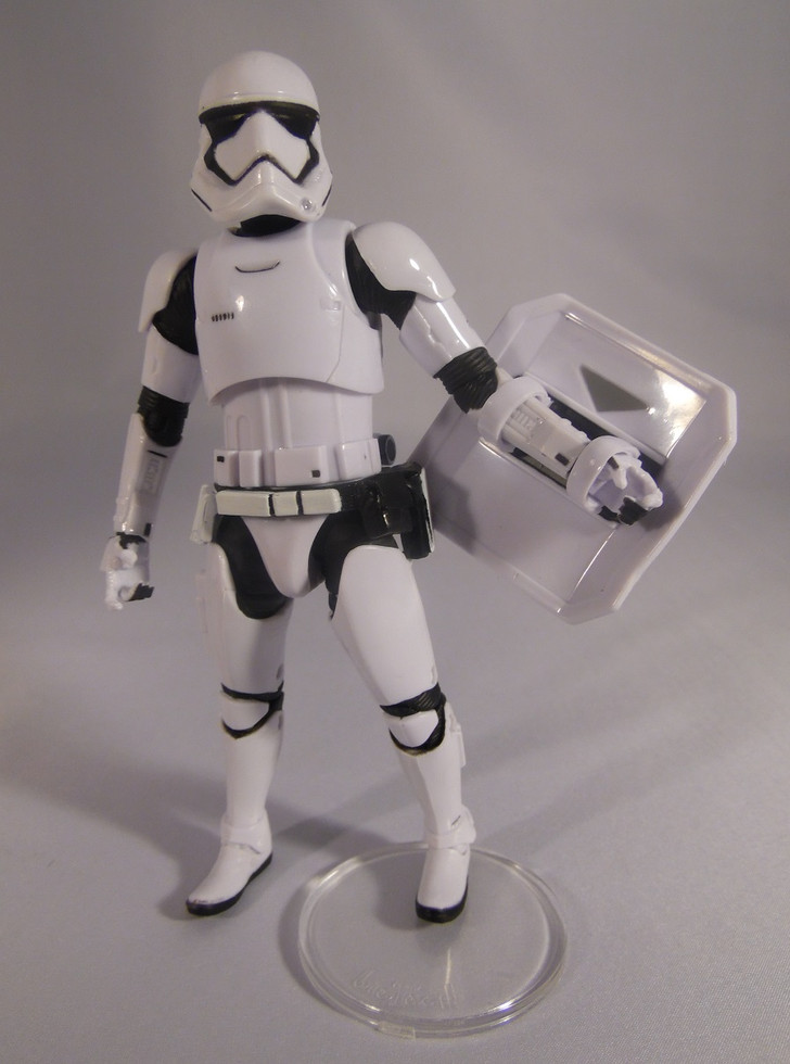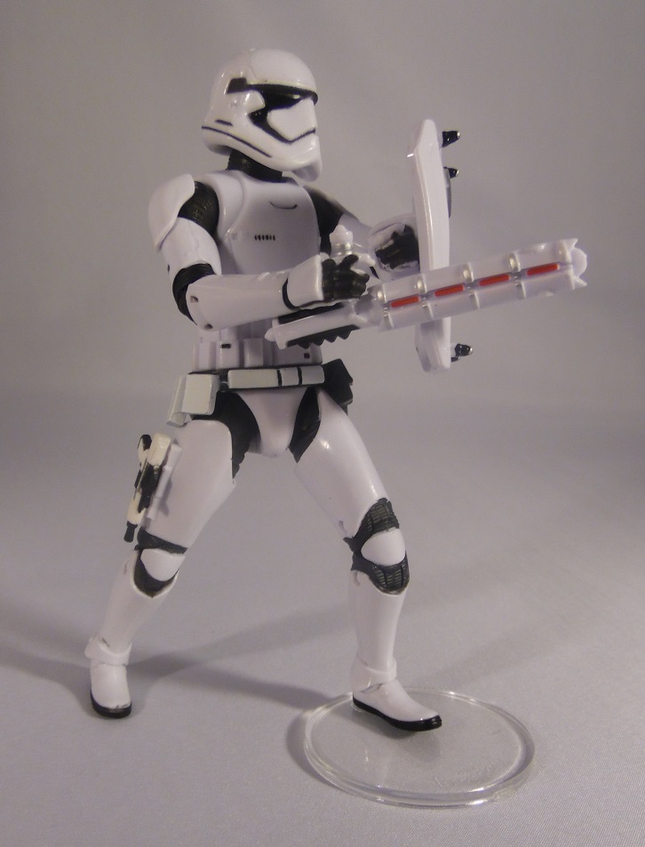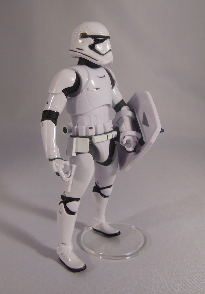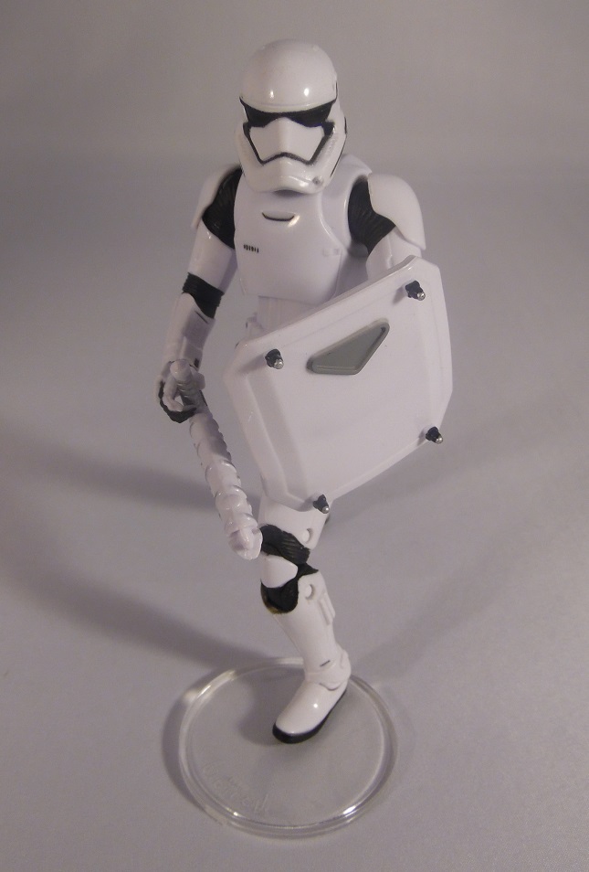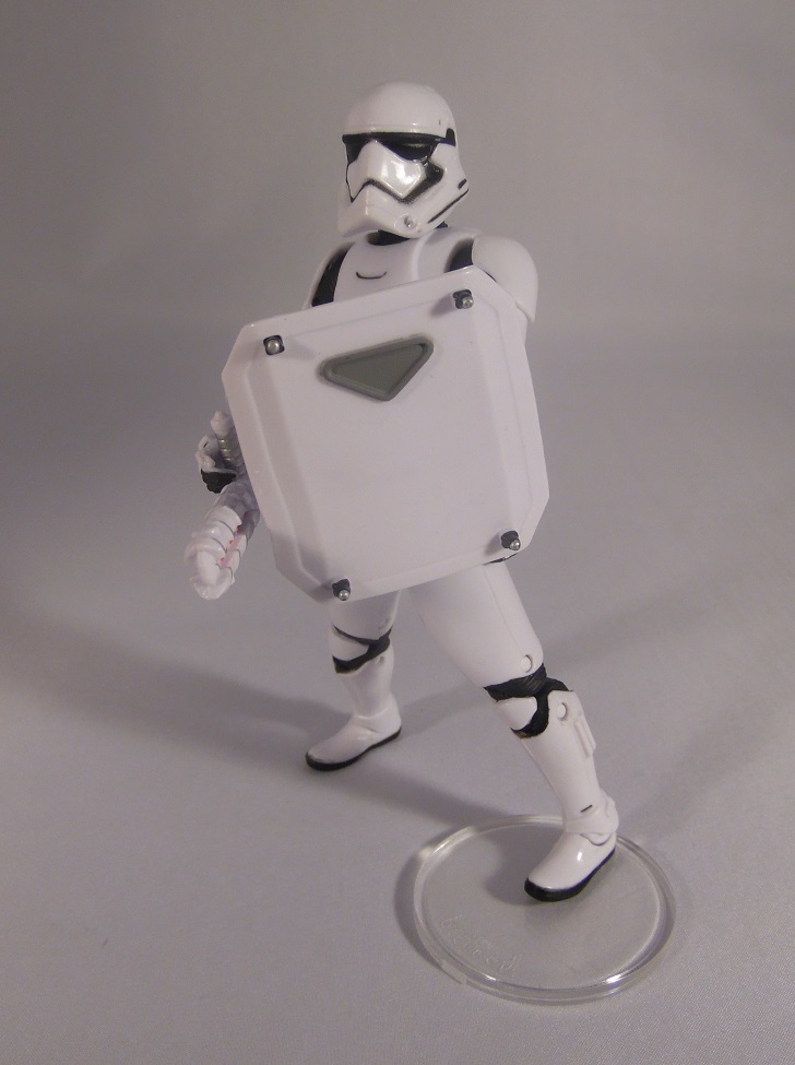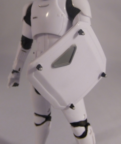 The differences on this Trooper are basically the accessories. As a bonus he still comes with both weapons that the standard version is packed with. This means that if you aren't a fan of the riot gear you can simply tool him up as a standard trooper. The shield comes ready strapped to the arm, and although it would probably come off with some wriggling and a bit of force I have left mine alone for now. The shield is a solid accessory, shaped and decorated on the front with 4 spike studs and a triangular panel which may or may not be a viewing slot. Round the back the two arm straps sit neatly on the troopers left hand and with the articulation of the arms the shield can be positioned in a number of poses.