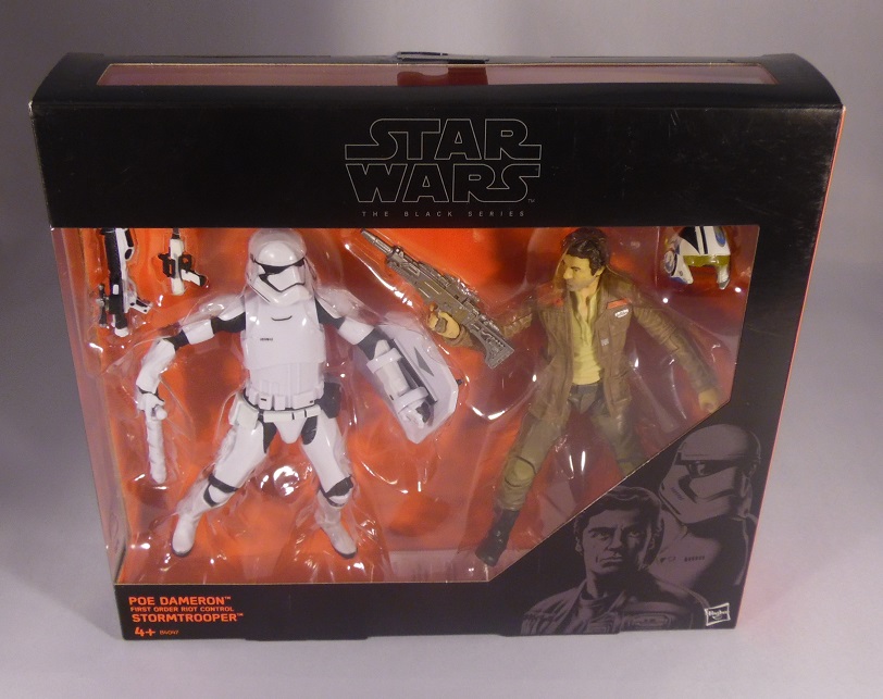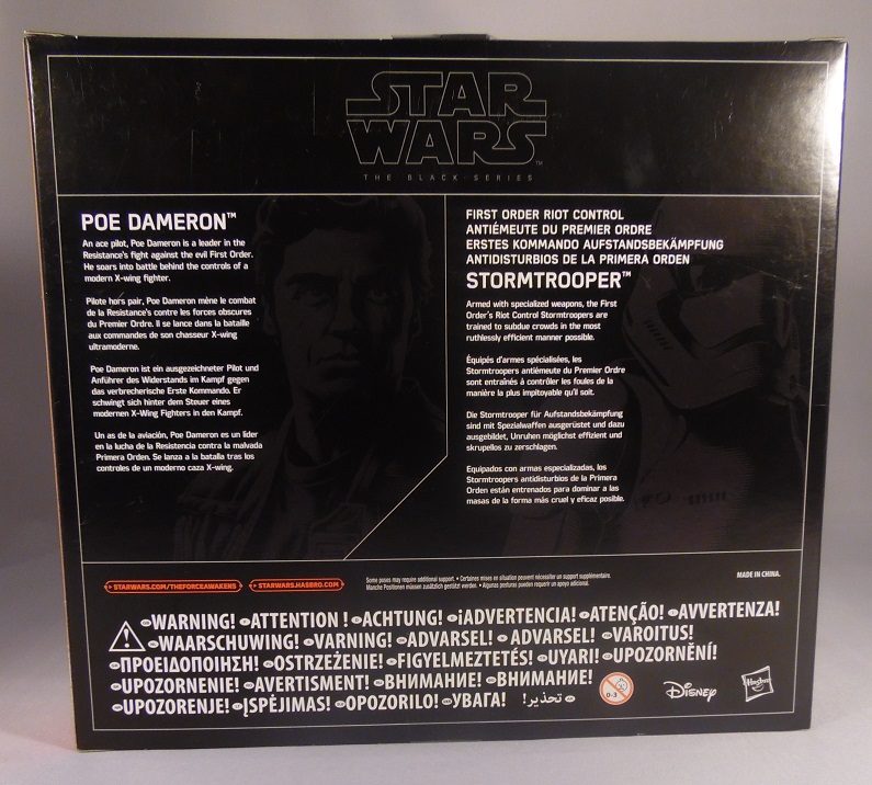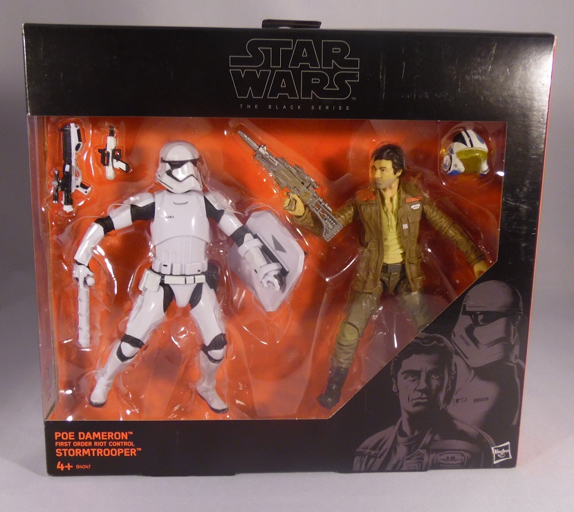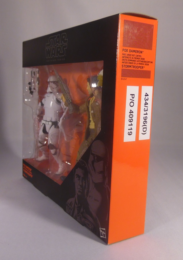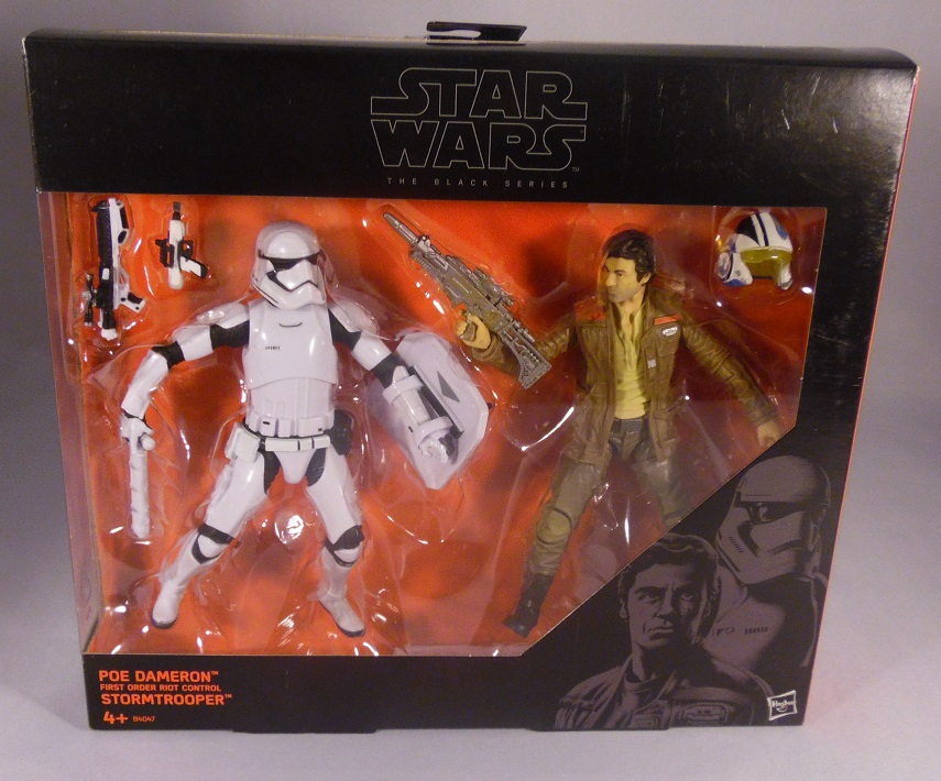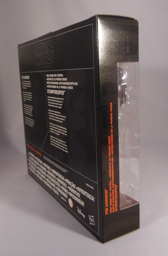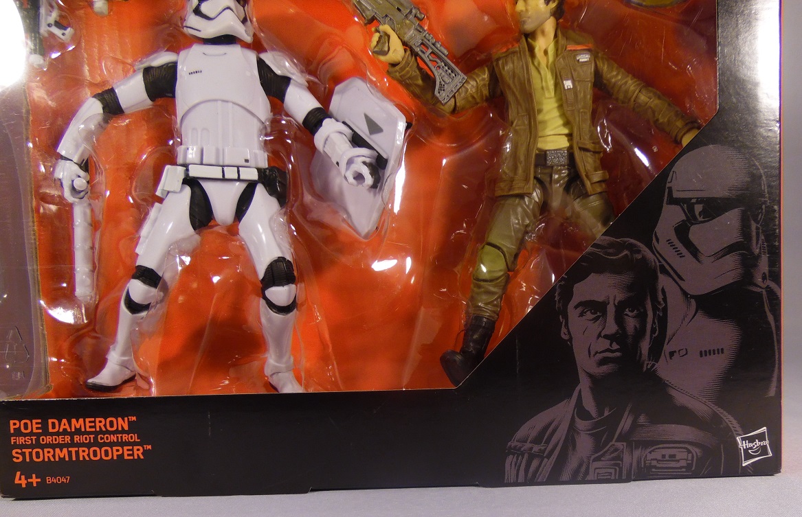 The box is essentially double the size of a normal Black Series box and other than that is identical in design. The black trimmed front holds a dual line drawing of Poe and the Storm Trooper. The sides are both red, but without the numbering system we see on the standard releases. On the reverse the bio's are split into two. Poe's bio is word for word identical to his wave 2 pilot release, while the Storm Trooper text is a new paragraph and details this Trooper's role as Riot Control.