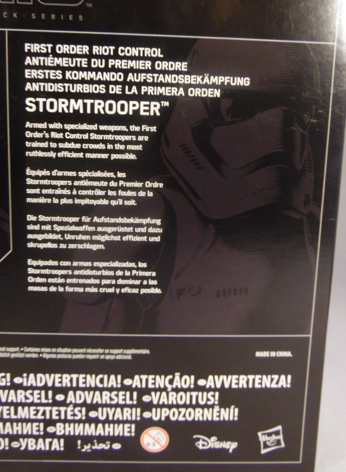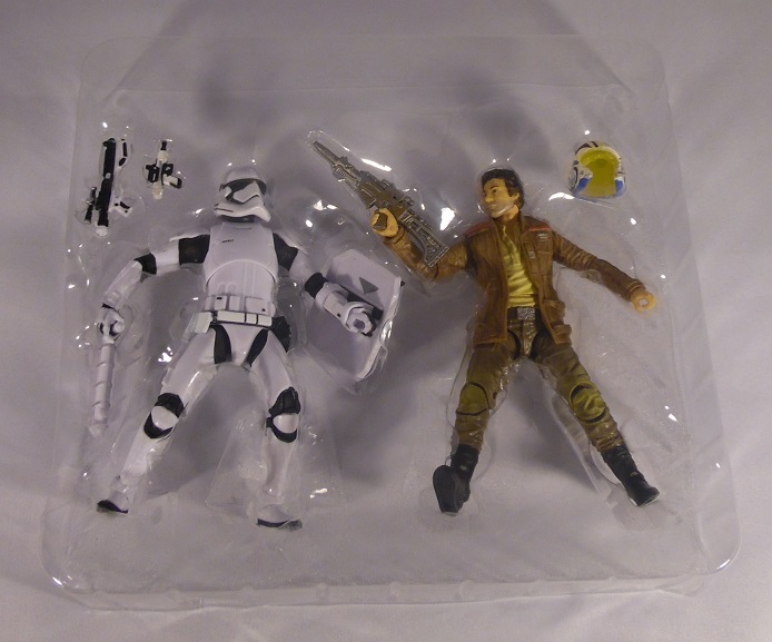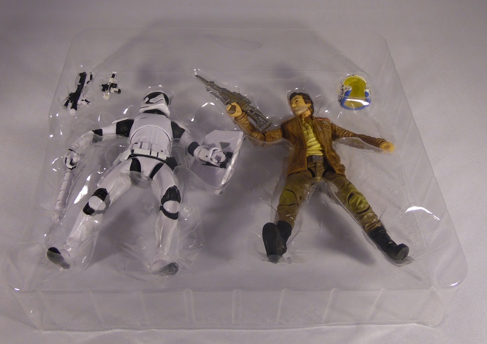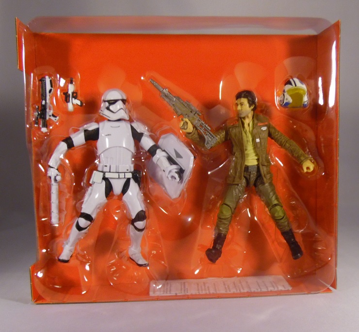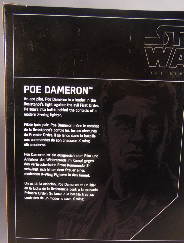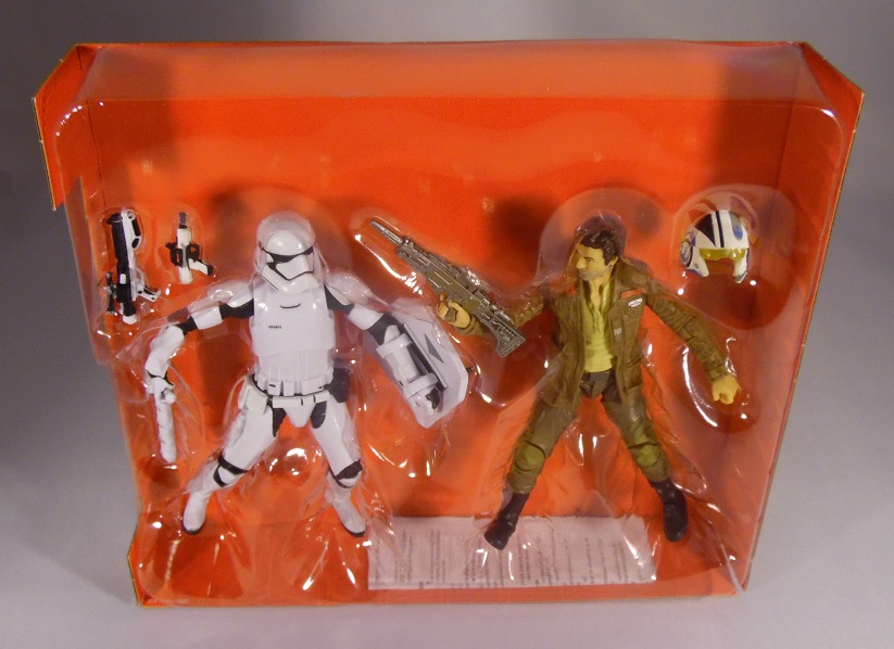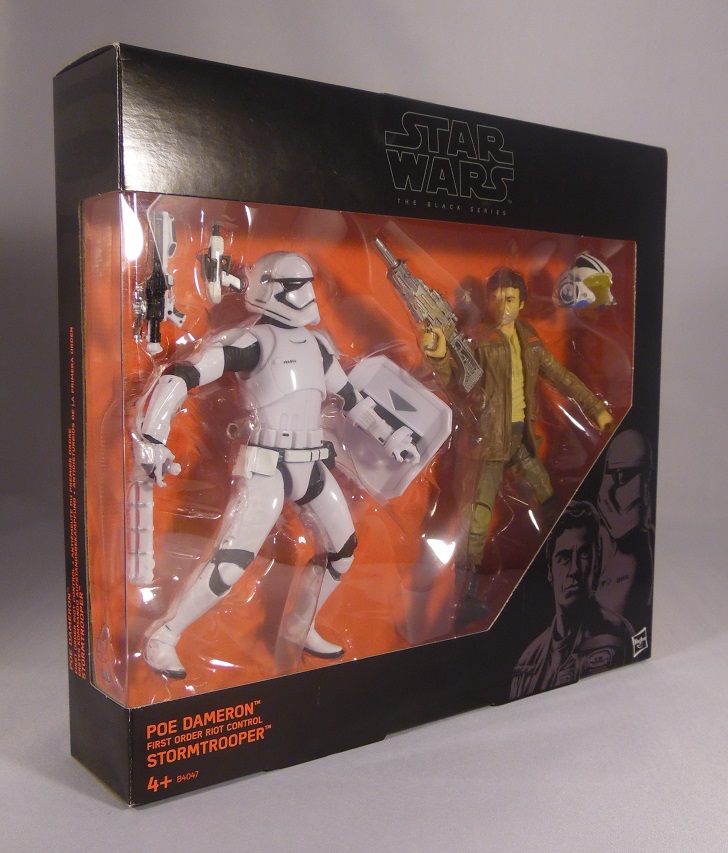 The box is essentially double the size of a normal Black Series box and other than that is identical in design. The black trimmed front holds a dual line drawing of Poe and the Storm Trooper. The sides are both red, but without the numbering system we see on the standard releases. On the reverse the bio's are split into two. Poe's bio is word for word identical to his wave 2 pilot release, while the Storm Trooper text is a new paragraph and details this Trooper's role as Riot Control.