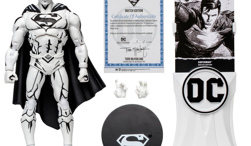 Entertainment Earth Exclusive! Superman leaps from the pages of DC Comics with monochromatic artist-sketch deco! This black-and-white Superman features alternate hands, a display base, and an art card stand. Included is an exclusive art card featuring a sketch of Superman on one side and a numbered certificate of authenticity on the other. Fully articulated, the incredibly detailed DC Multiverse Superman Rebirth Sketch Edition Gold Label 7-Inch Scale Action Figure - Entertainment Earth Exclusive stands roughly 7-inches tall. With strong contrasts between light and dark, this striking rendition of the Man of Steel is showcased in deluxe window-box packaging. He's limited to 3,000 pieces, so don't wait to add the Last Son of Krypton to your collection! Ages 14 and up.