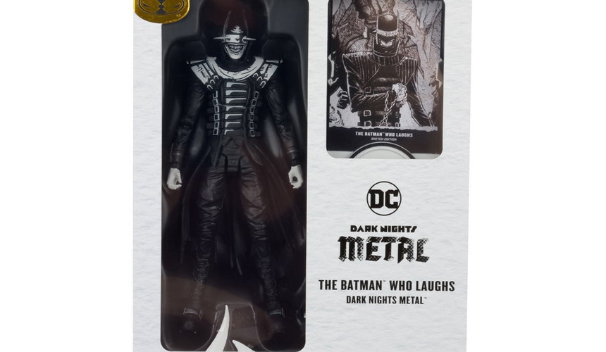 Entertainment Earth Exclusive! The Batman Who Laughs from the pages of Dark Nights Metal - with monochromatic artist sketch deco! This sinister black-and-white Batman comes with a knife, sickle, display base, and art card stand. Also included is an exclusive art card featuring a sketch of The Batman Who Laughs on one side and a numbered certificate of authenticity on the other. Fully articulated, the incredibly detailed DC Multiverse The Batman Who Laughs Sketch Edition Gold Label 7-Inch Scale Action Figure - Entertainment Earth Exclusive stands roughly 7-inches tall. With strong contrasts between light and dark, this striking rendition of the twisted Dark Knight is showcased in deluxe window-box packaging. He's limited to 3,000 pieces, so don't wait to add the scourge of the Multiverse to your collection! Ages 14 and up.