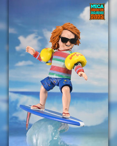 Ride the waves with everyone’s favorite serial killer doll, Chucky! NECA is stoked to present this Ultimate Chucky action figure inspired by one of the unused concept posters from the third installment of the Chucky horror franchise. Surfing into San Diego, Chucky is bringing chill beach vibes mixed with his infamous, murderous charm. But don’t let this laid-back surfer dude fool you... he’ll wipe out anyone when the time is right! Featuring the same articulation and scale as the rest of our Chucky Ultimates, he’s ready to hang ten in his Good Guys-themed rash guard, board shorts, and flip flops. Accessories include interchangeable heads and hands, sunglasses, suntan lotion, soft goods fabric towel, arm floaties, surfboard, and a wave base for the surfboard. This 2025 Con Exclusive is only available in limited quantities so don’t be a barney and miss out! Comes in collector-friendly window box packaging with opening front flap.