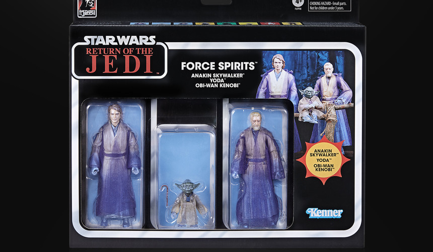 Commemorate the 40th Anniversary of STAR WARS: RETURN OF THE JEDI with this STAR WARS: THE BLACK SERIES FORCE SPIRITS three-pack, featuring classic design and packaging! These premium 6-inch-scale figures are inspired by the iconic moment in STAR WARS: RETURN OF THE JEDI, when Luke Skywalker witnesses the Force Spirits of the people who shaped him: Anakin, Obi-Wan, and Yoda. Fans can display this figure which features premium detail, multiple points of articulation in their collections. Includes 3 figures.