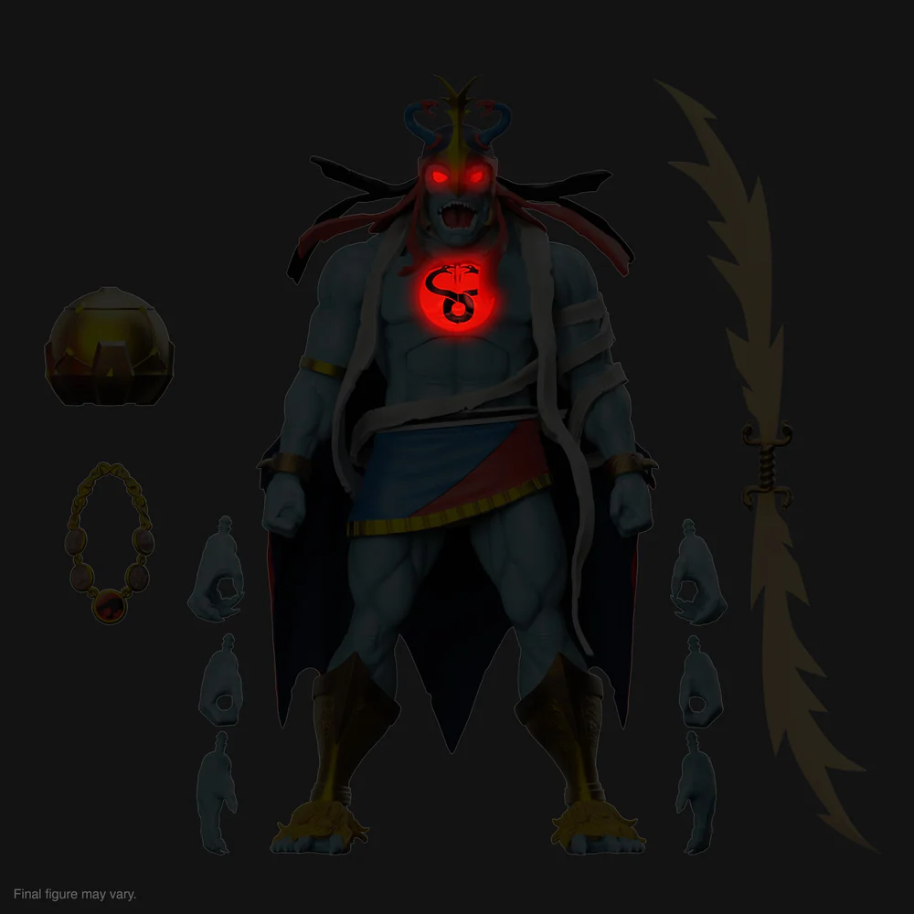 Sorcerer and demon-priest, Mumm-Ra™ is such a mighty foe that his mere gaze can terrify even the most resolute hero who would dare stand against him! This 7” scale, highly articulated ThunderCats ULTIMATES! Mumm-Ra™ figure is inspired by the classic animated television series and features battery-powered light-up LED eyes, and intricate sculpt and premium paint detailing. Also included are multiple interchangeable hands, as well as an assortment of accessories including a poseable soft goods cape, a Golden Sphere of Seti, a Chain of Loyalty, and a glow-in-the-dark Sword of Plun-Darr. This fearsome, light-up LED eyed Mumm-Ra™ figure is so intimidating it may cause the other characters in your ThunderCats collection to shake in fear!